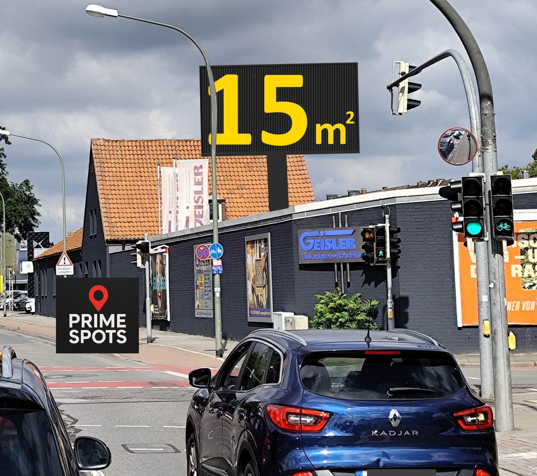 Ein freischwebender LED-Tower in bis zu neun Metern Höhe, direkt am Kreuzungsbereich Hansastraße / Mühleneschweg. Pendler und Konsumenten erleben hier digitale Außenwerbung in einer neuen Dimension.